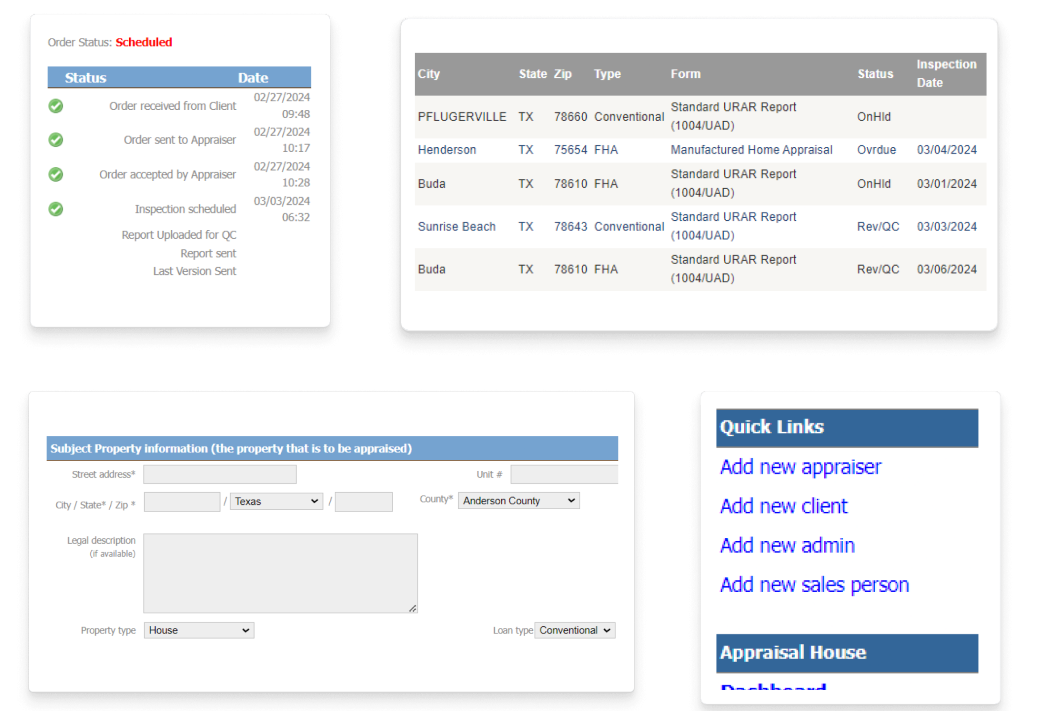 An extensive SaaS web application designed for a real estate appraisal management company (AMC) in Austin, Texas. This application simplifies the entire workflow of real estate appraisal order management, covering tasks like order acceptance, appraiser allocation, reminders, automated triggers, and generating reports. With a centralized interface, the application provides a comprehensive platform for the client, lenders, and appraisers to oversee and handle all aspects of the real estate appraisal order workflow efficiently.
